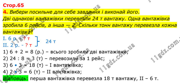 Вибери посильне для себе завдання і виконай його. Дві однакові вантажівки перевезли 24 т вантажу. Одна вантажівка зробила 6 рейсів, а інша — 2. Скільки тонн вантажу перевезла кожна вантажівка? І. 6 р. - ? т ІІ. 2 р. - ? т 1) 6 + 2 = 8 (р.) – всього зробили дві вантажівки; 2) 24 : 8 = 3 (т) – перевозили за 1 рейс; 3) 6 • 3 = 18 (т) – І вантажівка; 4) 2 • 3 = 6 (т) – ІІ вантажівка; Відповідь: перша вантажівка перевезла 18 т вантажу, ІІ – 6 т.