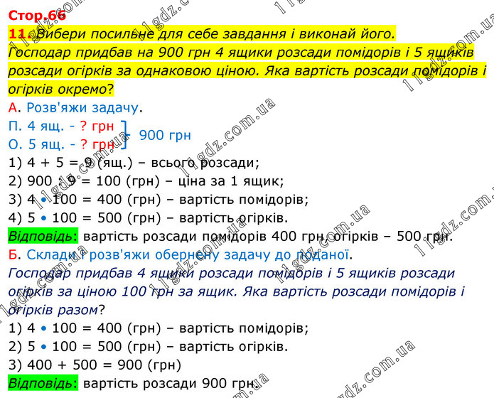 11. Вибери посильне для себе завдання і виконай його. Господар придбав на 900 грн 4 ящики розсади помідорів і 5 ящиків розсади огірків за однаковою ціною. Яка вартість розсади помідорів і огірків окремо? А. Розв'яжи задачу. П. 4 ящ. - ? грн О. 5 ящ. - ? грн 1) 4 + 5 = 9 (ящ.) – всього розсади; 2) 900 : 9 = 100 (грн) – ціна за 1 ящик; 3) 4 • 100 = 400 (грн) – вартість помідорів; 4) 5 • 100 = 500 (грн) – вартість огірків. Відповідь: вартість розсади помідорів 400 грн, огірків – 500 грн. Б. Склади і розв'яжи обернену задачу до поданої. Господар придбав 4 ящики розсади помідорів і 5 ящиків розсади огірків за ціною 100 грн за ящик. Яка вартість розсади помідорів і огірків разом? 1) 4 • 100 = 400 (грн) – вартість помідорів; 2) 5 • 100 = 500 (грн) – вартість огірків. 3) 400 + 500 = 900 (грн) Відповідь: вартість розсади 900 грн.