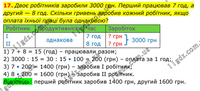 Двоє робітників заробили 3000 грн. Перший працював 7 год, а другий — 8 год. Скільки гривень заробив кожний робітник, якщо оплата їхньої праці була однаковою? 1) 7 + 8 = 15 (год) – працювали разом; 2) 3000 : 15 = 30 : 15 • 100 = 200 (грн) – оплата за 1 год; 3) 7 • 200 = 1400 (грн) – заробив І робітник; 4) 8 • 200 = 1600 (грн) – заробив ІІ робітник. Відповідь: перший робітник заробив 1400 грн, другий 1600 грн.