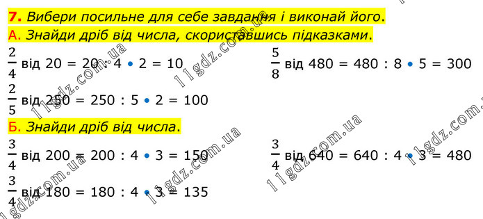 Вибери посильне для себе завдання і виконай його. А. Знайди дріб від числа, скориставшись підказками. 2/4 від 20 = 20 : 4 • 2 = 10 2/5 від 250 = 250 : 5 • 2 = 100 5/8 від 480 = 480 : 8 • 5 = 300 Б. Знайди дріб від числа. 3/4 від 200 = 200 : 4 • 3 = 150 3/4 від 180 = 180 : 4 • 3 = 135 3/4 від 640 = 640 : 4 • 3 = 480