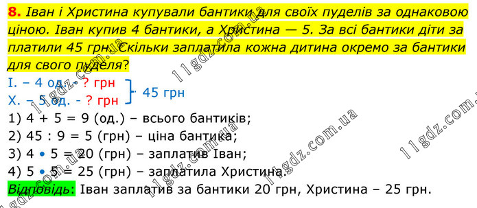 Іван і Христина купували бантики для своїх пуделів за однаковою ціною. Іван купив 4 бантики, а Христина — 5. За всі бантики діти за платили 45 грн. Скільки заплатила кожна дитина окремо за бантики для свого пуделя? І. – 4 од. - ? грн Х. – 5 од. - ? грн 1) 4 + 5 = 9 (од.) – всього бантиків; 2) 45 : 9 = 5 (грн) – ціна бантика; 3) 4 • 5 = 20 (грн) – заплатив Іван; 4) 5 • 5 = 25 (грн) – заплатила Христина. Відповідь: Іван заплатив за бантики 20 грн, Христина – 25 грн.