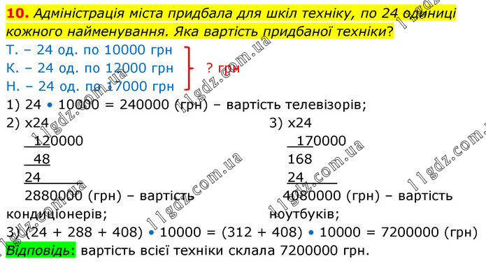 Адміністрація міста придбала для шкіл техніку, по 24 одиниці кожного найменування. Яка вартість придбаної техніки? Т. – 24 од. по 10000 грн К. – 24 од. по 12000 грн ? грн Н. – 24 од. по 17000 грн 1) 24 • 10000 = 240000 (грн) – вартість телевізорів; 4) (24 + 288 + 408) • 10000 = (312 + 408) • 10000 = 7200000 (грн) Відповідь: вартість всієї техніки склала 7200000 грн.