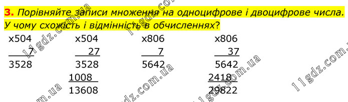 Порівняйте записи множення на одноцифрове і двоцифрове числа. У чому схожість і відмінність в обчисленнях?