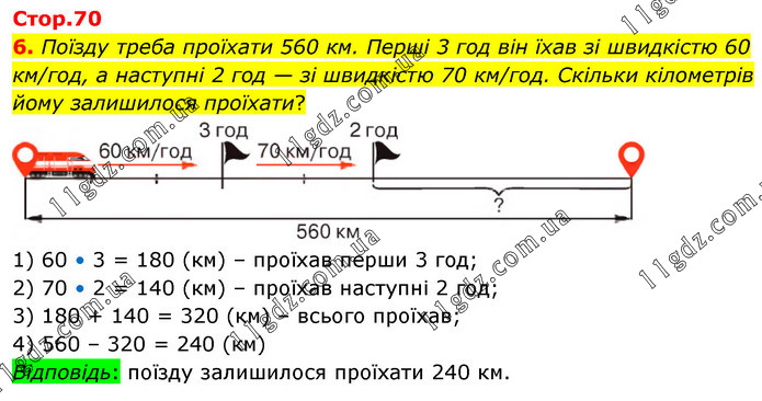 6. Поїзду треба проїхати 560 км. Перші 3 год він їхав зі швидкістю 60 км/год, а наступні 2 год — зі швидкістю 70 км/год. Скільки кілометрів йому залишилося проїхати? 1) 60 • 3 = 180 (км) – проїхав перши 3 год; 2) 70 • 2 = 140 (км) – проїхав наступні 2 год; 3) 180 + 140 = 320 (км) – всього проїхав; 4) 560 – 320 = 240 (км) Відповідь: поїзду залишилося проїхати 240 км.