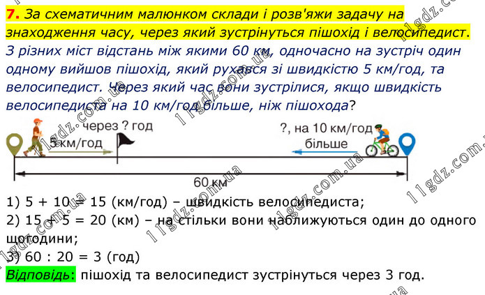 За схематичним малюнком склади і розв'яжи задачу на знаходження часу, через який зустрінуться пішохід і велосипедист. З різних міст відстань між якими 60 км, одночасно на зустріч один одному вийшов пішохід, який рухався зі швидкістю 5 км/год, та велосипедист. Через який час вони зустрілися, якщо швидкість велосипедиста на 10 км/год більше, ніж пішохода? 1) 5 + 10 = 15 (км/год) – швидкість велосипедиста; 2) 15 + 5 = 20 (км) – на стільки вони наближуються один до одного щогодини; 3) 60 : 20 = 3 (год) Відповідь: пішохід та велосипедист зустрінуться через 3 год.