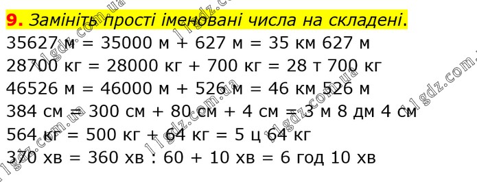 Замініть прості іменовані числа на складені. 35627 м = 35000 м + 627 м = 35 км 627 м 28700 кг = 28000 кг + 700 кг = 28 т 700 кг 46526 м = 46000 м + 526 м = 46 км 526 м 384 см = 300 см + 80 см + 4 см = 3 м 8 дм 4 см 564 кг = 500 кг + 64 кг = 5 ц 64 кг 370 хв = 360 хв : 60 + 10 хв = 6 год 10 хв