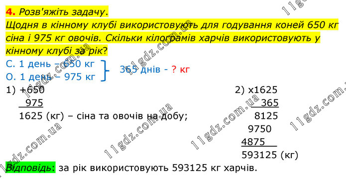 Розв'яжіть задачу. Щодня в кінному клубі використовують для годування коней 650 кг сіна і 975 кг овочів. Скільки кілограмів харчів використовують у кінному клубі за рік?