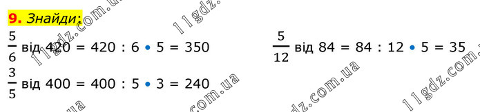 Знайди: 5/6 від 420 = 420 : 6 • 5 = 350 3/5 від 400 = 400 : 5 • 3 = 240 5/12 від 84 = 84 : 12 • 5 = 35