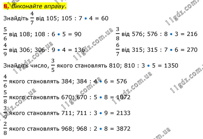 Виконайте вправу. Знайдіть 4/7 від 105; 105 : 7 • 4 = 60 5/6 від 108; 108 : 6 • 5 = 90 4/9 від 306; 306 : 9 • 4 = 136 3/8 від 576; 576 : 8 • 3 = 216 6/7 від 315; 315 : 7 • 6 = 270 Знайдіть число, 3/5 якого становлять 810; 810 : 3 • 5 = 1350 4/6 якого становлять 384; 384 : 4 • 6 = 576 5/8 якого становлять 670; 670 : 5 • 8 = 1072 3/9 якого становлять 711; 711 : 3 • 9 = 2133 2/8 якого становлять 968; 968 : 2 • 8 = 3872