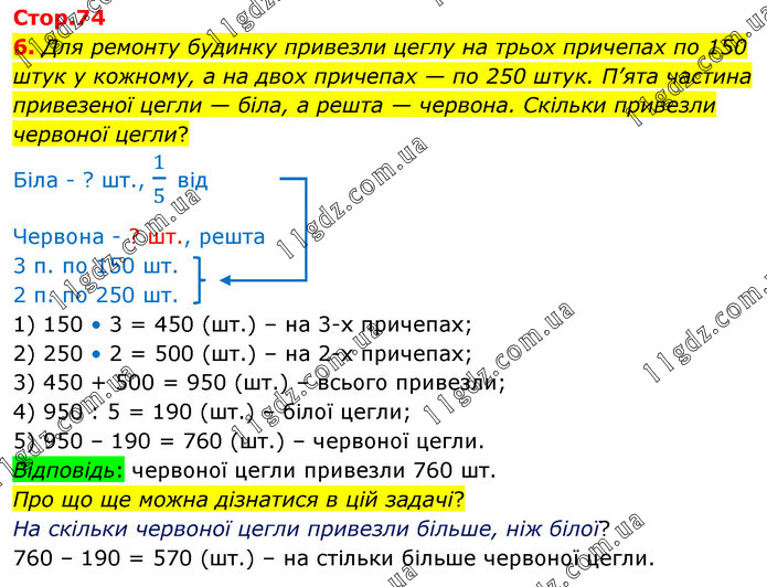 6. Для ремонту будинку привезли цеглу на трьох причепах по 150 штук у кожному, а на двох причепах — по 250 штук. П’ята частина привезеної цегли — біла, а решта — червона. Скільки привезли червоної цегли? Біла - ? шт., 1/5 від Червона - ? шт., решта 3 п. по 150 шт. 2 п. по 250 шт. 1) 150 • 3 = 450 (шт.) – на 3-х причепах; 2) 250 • 2 = 500 (шт.) – на 2-х причепах; 3) 450 + 500 = 950 (шт.) – всього привезли; 4) 950 : 5 = 190 (шт.) – білої цегли; 5) 950 – 190 = 760 (шт.) – червоної цегли. Відповідь: червоної цегли привезли 760 шт. Про що ще можна дізнатися в цій задачі? На скільки червоної цегли привезли більше, ніж білої? 760 – 190 = 570 (шт.) – на стільки більше червоної цегли.