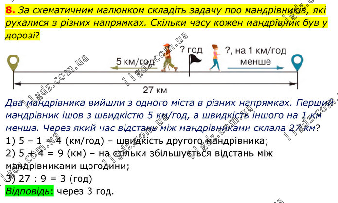 За схематичним малюнком складіть задачу про мандрівників, які рухалися в різних напрямках. Скільки часу кожен мандрівник був у дорозі? Два мандрівника вийшли з одного міста в різних напрямках. Перший мандрівник ішов з швидкістю 5 км/год, а швидкість іншого на 1 км менша. Через який час відстань між мандрівниками склала 27 км? 1) 5 – 1 = 4 (км/год) – швидкість другого мандрівника; 2) 5 + 4 = 9 (км) – на стільки збільшується відстань між мандрівниками щогодини; 3) 27 : 9 = 3 (год) Відповідь: через 3 год.
