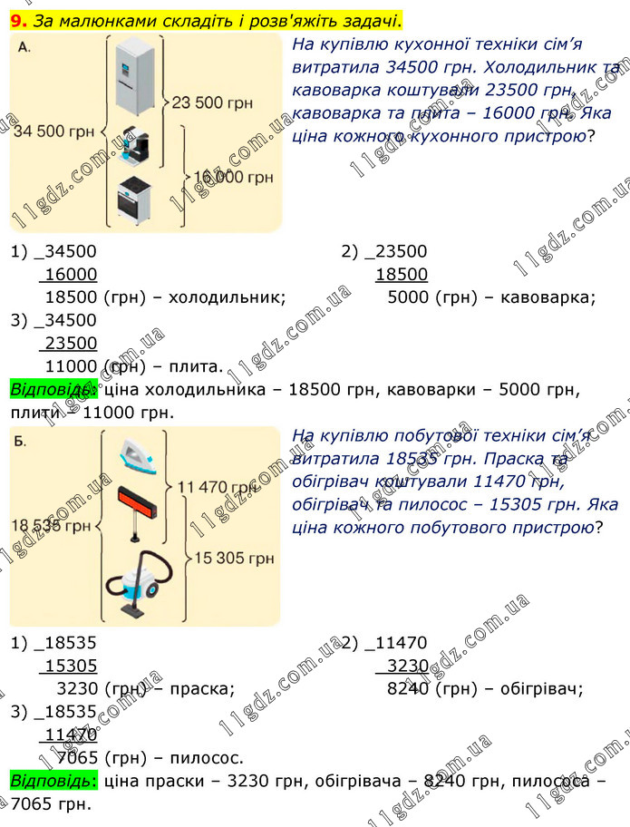 За малюнками складіть і розв'яжіть задачі. На купівлю кухонної техніки сім’я витратила 34500 грн. Холодильник та кавоварка коштували 23500 грн, кавоварка та плита – 16000 грн. Яка ціна кожного кухонного пристрою? На купівлю побутової техніки сім’я витратила 18535 грн. Праска та обігрівач коштували 11470 грн, обігрівач та пилосос – 15305 грн. Яка ціна кожного побутового пристрою?