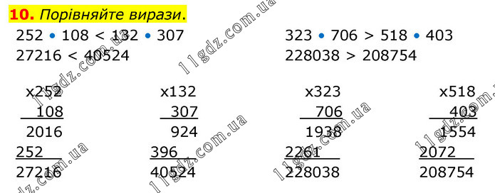 Порівняйте вирази. 252 • 108 < 132 • 307 27216 < 40524 323 • 706 > 518 • 403 228038 > 208754