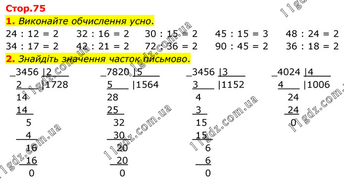 1. Виконайте обчислення усно. 24 : 12 = 2 34 : 17 = 2 32 : 16 = 2 42 : 21 = 2 30 : 15 = 2 72 : 36 = 2 45 : 15 = 3 90 : 45 = 2 48 : 24 = 2 36 : 18 = 2