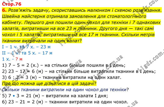 6. Розв'яжіть задачу, скориставшись малюнком і схемою розв'язання. Швейна майстерня отримала замовлення для стоматологічного кабінету. Першого дня пошили один чохол для техніки і 7 однакових халатів, витративши на все 23 м тканини. Другого дня — такі самі чохол і 5 халатів, витративши на все 17 м тканини. Скільки метрів тканини витрачали на один халат? І – 1 ч. та 7 х. – 23 м ІІ – 1 ч. та 5 х. – 17 м 1 х. - ? м 1) 7 – 5 = 2 (х.) – на стільки більше пошили в І день; 2) 23 – 17 = 6 (м) – на стільки більше витратили тканини в І день; 3) 6 : 2 = 3 (м) – тканини витратили на один халат. Про що можна ще дізнатися в цій задачі? Скільки тканини витратили на один чохол для техніки? 5) 7 • 3 = 21 (м) – витратили на халати І дня; 6) 23 – 21 = 2 (м) – тканини витратили на один чохол.