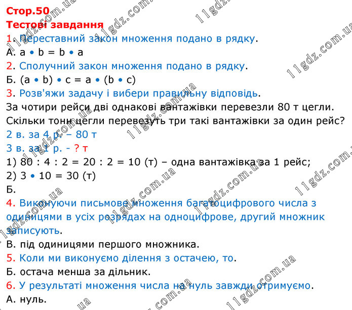 Тестові завдання 1. Переставний закон множення подано в рядку. А. a • b = b • a 2. Сполучний закон множення подано в рядку. Б. (a • b) • c = a • (b • c) 3. Розв'яжи задачу і вибери правильну відповідь. За чотири рейси дві однакові вантажівки перевезли 80 т цегли. Скільки тонн цегли перевезуть три такі вантажівки за один рейс? 2 в. за 4 р. – 80 т 3 в. за 1 р. - ? т 1) 80 : 4 : 2 = 20 : 2 = 10 (т) – одна вантажівка за 1 рейс; 2) 3 • 10 = 30 (т) Б. 4. Виконуючи письмове множення багатоцифрового числа з одиницями в усіх розрядах на одноцифрове, другий множник записують. В. під одиницями першого множника. 5. Коли ми виконуємо ділення з остачею, то. Б. остача менша за дільник. 6. У результаті множення числа на нуль завжди отримуємо. А. нуль.