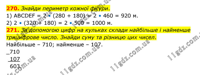 270. Знайди периметр кожної фігури. 1) ABCDEF = 2 • (280 + 180) = 2 • 460 = 920 м. 2) 2 • (320 + 180) = 2 • 500 = 1000 м. 271. За допомогою цифр на кульках склади найбільше і найменше трицифрове число. Знайди суму та різницю цих чисел. Найбільше – 710; найменше – 107.