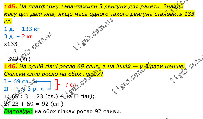 На платформу завантажили 3 двигуни для ракети. Знайди масу цих двигунів, якщо маса одного такого двигуна становить 133 кг. 146. На одній гілці росло 69 слив, а на іншій — у 3 рази менше. Скільки слив росло на обох гілках? І – 69 сл. ІІ – ?, у 3 р. < 1) 69 : 3 = 23 (сл.) – на ІІ гілці; 2) 23 + 69 = 92 (сл.) Відповідь: на обох гілках росло 92 сливи.