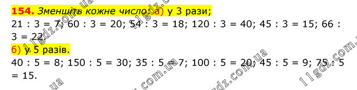 Зменшіть кожне число: а) у 3 рази; 21 : 3 = 7; 60 : 3 = 20; 54 : 3 = 18; 120 : 3 = 40; 45 : 3 = 15; 66 : 3 = 22. б) у 5 разів. 40 : 5 = 8; 150 : 5 = 30; 35 : 5 = 7; 100 : 5 = 20; 45 : 5 = 9; 75 : 5 = 15.