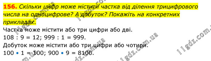 Скільки цифр може містити частка від ділення трицифрового числа на одноцифрове? А добуток? Покажіть на конкретних прикладах. Частка може містити або три цифри або дві. 108 : 9 = 12; 999 : 1 = 999. Добуток може містити або три цифри або чотири. 100 • 1 = 100; 900 • 9 = 8100.