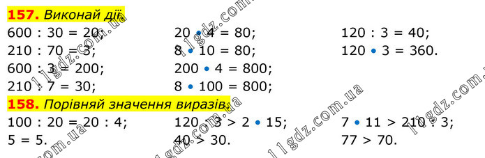 157. Виконай дії. 600 : 30 = 20; 210 : 70 = 3; 600 : 3 = 200; 210 : 7 = 30; 20 • 4 = 80; 8 • 10 = 80; 200 • 4 = 800; 8 • 100 = 800; 120 : 3 = 40; 120 • 3 = 360. 158. Порівняй значення виразів. 100 : 20 = 20 : 4; 5 = 5. 120 : 3 > 2 • 15; 40 > 30. 7 • 11 > 210 : 3; 77 > 70.