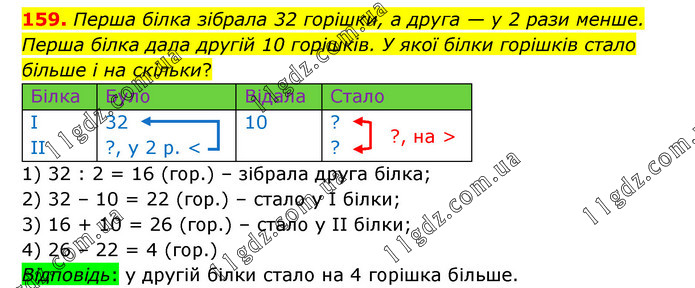Перша білка зібрала 32 горішки, а друга — у 2 рази менше. Перша білка дала другій 10 горішків. У якої білки горішків стало більше і на скільки? 1) 32 : 2 = 16 (гор.) – зібрала друга білка; 2) 32 – 10 = 22 (гор.) – стало у І білки; 3) 16 + 10 = 26 (гор.) – стало у ІІ білки; 4) 26 – 22 = 4 (гор.) Відповідь: у другій білки стало на 4 горішка більше.