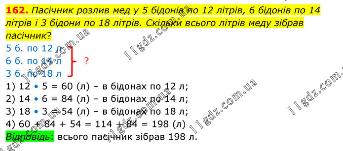 Пасічник розлив мед у 5 бідонів по 12 літрів, 6 бідонів по 14 літрів і 3 бідони по 18 літрів. Скільки всього літрів меду зібрав пасічник? 5 б. по 12 л 6 б. по 14 л ? 3 б. по 18 л 1) 12 • 5 = 60 (л) – в бідонах по 12 л; 2) 14 • 6 = 84 (л) – в бідонах по 14 л; 3) 18 • 3 = 54 (л) – в бідонах по 18 л; 4) 60 + 84 + 54 = 114 + 84 = 198 (л) Відповідь: всього пасічник зібрав 198 л.