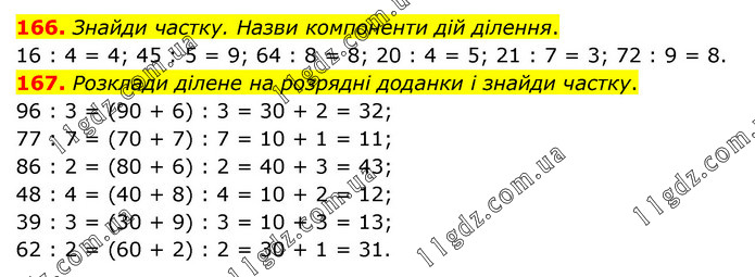 166. Знайди частку. Назви компоненти дій ділення. 16 : 4 = 4; 45 : 5 = 9; 64 : 8 = 8; 20 : 4 = 5; 21 : 7 = 3; 72 : 9 = 8. 167. Розклади ділене на розрядні доданки і знайди частку. 96 : 3 = (90 + 6) : 3 = 30 + 2 = 32; 77 : 7 = (70 + 7) : 7 = 10 + 1 = 11; 86 : 2 = (80 + 6) : 2 = 40 + 3 = 43; 48 : 4 = (40 + 8) : 4 = 10 + 2 = 12; 39 : 3 = (30 + 9) : 3 = 10 + 3 = 13; 62 : 2 = (60 + 2) : 2 = 30 + 1 = 31.