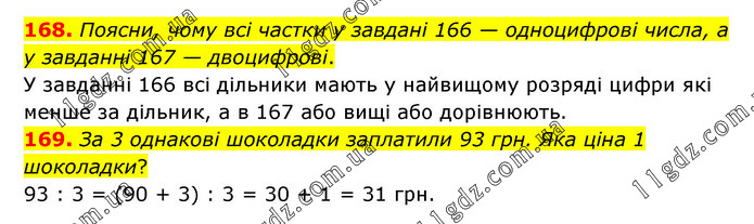 168. Поясни, чому всі частки у завдані 166 — одноцифрові числа, а у завданні 167 — двоцифрові. У завданні 166 всі дільники мають у найвищому розряді цифри які менше за дільник, а в 167 або вищі або дорівнюють. 169. За 3 однакові шоколадки заплатили 93 грн. Яка ціна 1 шоколадки? 93 : 3 = (90 + 3) : 3 = 30 + 1 = 31 грн.