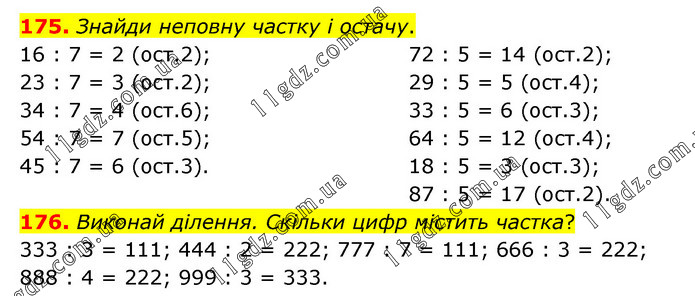 175. Знайди неповну частку і остачу. 16 : 7 = 2 (ост.2); 23 : 7 = 3 (ост.2); 34 : 7 = 4 (ост.6); 54 : 7 = 7 (ост.5); 45 : 7 = 6 (ост.3). 72 : 5 = 14 (ост.2); 29 : 5 = 5 (ост.4); 33 : 5 = 6 (ост.3); 64 : 5 = 12 (ост.4); 18 : 5 = 3 (ост.3); 87 : 5 = 17 (ост.2). 176. Виконай ділення. Скільки цифр містить частка? 333 : 3 = 111; 444 : 2 = 222; 777 : 7 = 111; 666 : 3 = 222; 888 : 4 = 222; 999 : 3 = 333.