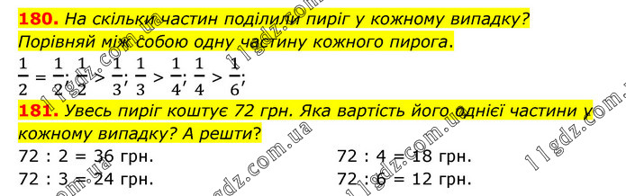 180. На скільки частин поділили пиріг у кожному випадку? Порівняй між собою одну частину кожного пирога. 1/2 = 1/2; 1/2 > 1/3; 1/3 > 1/4; 1/4 > 1/6; 181. Увесь пиріг коштує 72 грн. Яка вартість його однієї частини у кожному випадку? А решти? 72 : 2 = 36 грн. 72 : 3 = 24 грн. 72 : 4 = 18 грн. 72 : 6 = 12 грн.