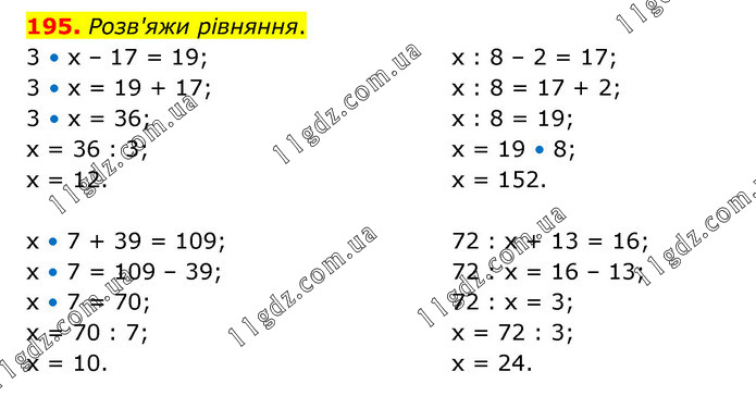 Розв'яжи рівняння. 3 • х – 17 = 19; 3 • х = 19 + 17; 3 • х = 36; х = 36 : 3; х = 12. х : 8 – 2 = 17; х : 8 = 17 + 2; х : 8 = 19; х = 19 • 8; х = 152. х • 7 + 39 = 109; х • 7 = 109 – 39; х • 7 = 70; х = 70 : 7; х = 10. 72 : х + 13 = 16; 72 : х = 16 – 13; 72 : х = 3; х = 72 : 3; х = 24.
