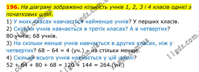 На діаграмі зображено кількість учнів 1, 2, 3 і 4 класів однієї з початкових шкіл. 1) У яких класах навчається найменше учнів? У перших класів. 2) Скільки учнів навчається в третіх класах? А в четвертих? 80 учнів; 68 учнів. 3) На скільки менше учнів навчається в других класах, ніж у четвертих? 68 – 64 = 4 (уч.) – на стільки менше. 4) Скільки всього учнів навчається у цій школі? 52 + 64 + 80 + 68 = 120 + 144 = 264 (уч.)