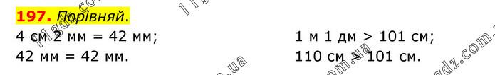 Порівняй. 4 см 2 мм = 42 мм; 42 мм = 42 мм. 1 м 1 дм > 101 см; 110 см > 101 см.