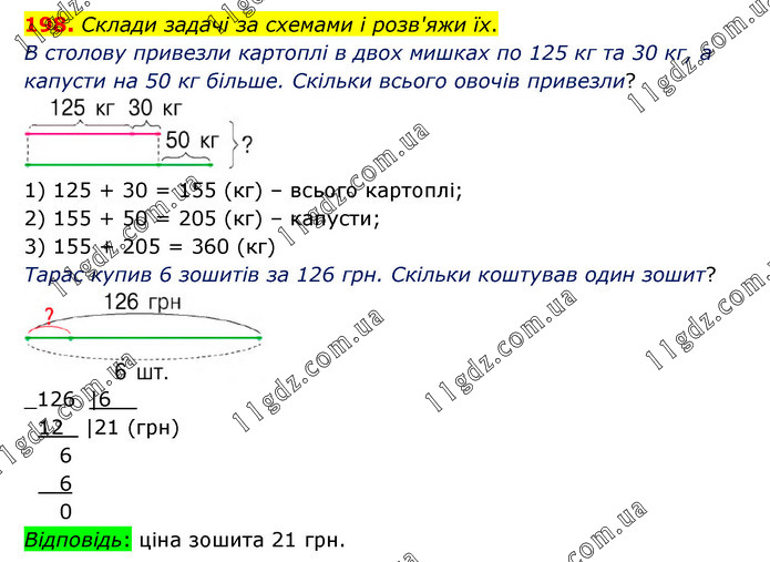 Склади задачі за схемами і розв'яжи їх. В столову привезли картоплі в двох мишках по 125 кг та 30 кг, а капусти на 50 кг більше. Скільки всього овочів привезли? 1) 125 + 30 = 155 (кг) – всього картоплі; 2) 155 + 50 = 205 (кг) – капусти; 3) 155 + 205 = 360 (кг) Тарас купив 6 зошитів за 126 грн. Скільки коштував один зошит? Відповідь: ціна зошита 21 грн.