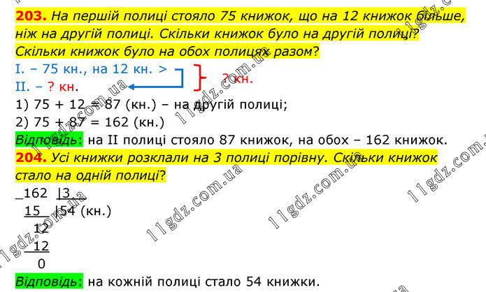 203. На першій полиці стояло 75 книжок, що на 12 книжок більше, ніж на другій полиці. Скільки книжок було на другій полиці? Скільки книжок було на обох полицях разом? І. – 75 кн., на 12 кн. > ІІ. – ? кн. 1) 75 + 12 = 87 (кн.) – на другій полиці; 2) 75 + 87 = 162 (кн.) Відповідь: на ІІ полиці стояло 87 книжок, на обох – 162 книжок. 204. Усі книжки розклали на 3 полиці порівну. Скільки книжок стало на одній полиці? Відповідь: на кожній полиці стало 54 книжки.