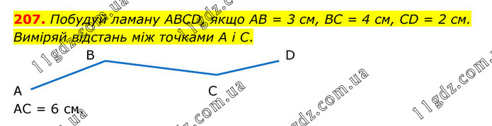 Побудуй ламану ABCD, якщо АВ = 3 см, ВС = 4 см, CD = 2 см. Виміряй відстань між точками А і С. АС = 6 см.