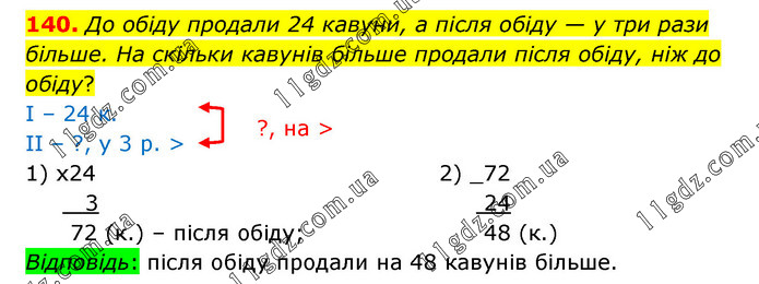 До обіду продали 24 кавуни, а після обіду — у три рази більше. На скільки кавунів більше продали після обіду, ніж до обіду? Відповідь: після обіду продали на 48 кавунів більше.