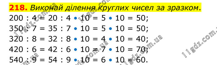Виконай ділення круглих чисел за зразком. 200 : 4 = 20 : 4 • 10 = 5 • 10 = 50; 350 : 7 = 35 : 7 • 10 = 5 • 10 = 50; 320 : 8 = 32 : 8 • 10 = 4 • 10 = 40; 420 : 6 = 42 : 6 • 10 = 7 • 10 = 70; 540 : 9 = 54 : 9 • 10 = 6 • 10 = 60.