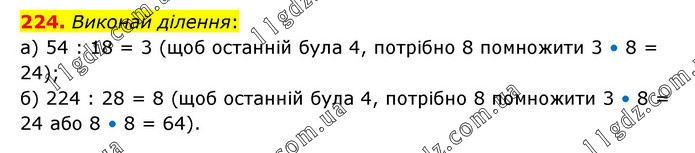 Виконай ділення: а) 54 : 18 = 3 (щоб останній була 4, потрібно 8 помножити 3 • 8 = 24); б) 224 : 28 = 8 (щоб останній була 4, потрібно 8 помножити 3 • 8 = 24 або 8 • 8 = 64).