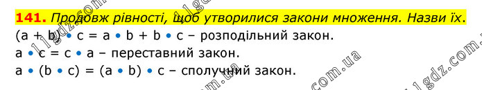 Продовж рівності, щоб утворилися закони множення. Назви їх. (а + b) • с = a • b + b • с – розподільний закон. a • с = c • a – переставний закон. a • (b • с) = (a • b) • с – сполучний закон.