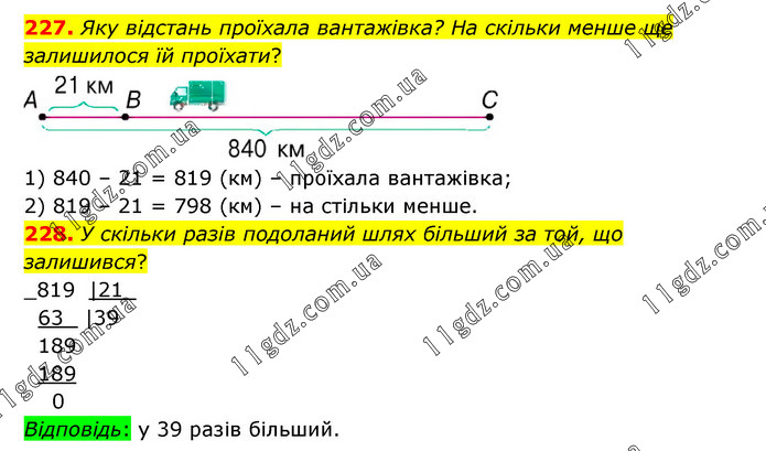 227. Яку відстань проїхала вантажівка? На скільки менше ще залишилося їй проїхати? 1) 840 – 21 = 819 (км) – проїхала вантажівка; 2) 819 – 21 = 798 (км) – на стільки менше. 228. У скільки разів подоланий шлях більший за той, що залишився? Відповідь: у 39 разів більший.