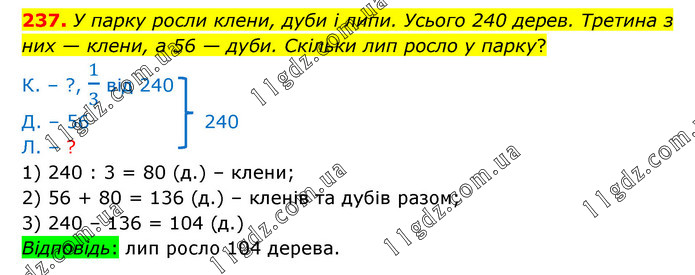 У парку росли клени, дуби і липи. Усього 240 дерев. Третина з них — клени, а 56 — дуби. Скільки лип росло у парку? К. – ?, 1/3 від 240 Д. – 56 240 Л. – ? 1) 240 : 3 = 80 (д.) – клени; 2) 56 + 80 = 136 (д.) – кленів та дубів разом; 3) 240 – 136 = 104 (д.) Відповідь: лип росло 104 дерева.