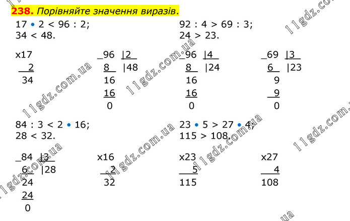 Порівняйте значення виразів. 17 • 2 < 96 : 2; 34 < 48. 92 : 4 > 69 : 3; 24 > 23. 84 : 3 < 2 • 16; 28 < 32. 23 • 5 > 27 • 4; 115 > 108.