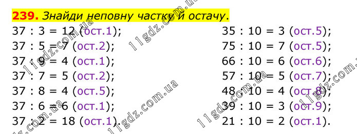 Знайди неповну частку й остачу. 37 : 3 = 12 (ост.1); 37 : 5 = 7 (ост.2); 37 : 9 = 4 (ост.1); 37 : 7 = 5 (ост.2); 37 : 8 = 4 (ост.5); 37 : 6 = 6 (ост.1); 37 : 2 = 18 (ост.1). 35 : 10 = 3 (ост.5); 75 : 10 = 7 (ост.5); 66 : 10 = 6 (ост.6); 57 : 10 = 5 (ост.7); 48 : 10 = 4 (ост.8); 39 : 10 = 3 (ост.9); 21 : 10 = 2 (ост.1).