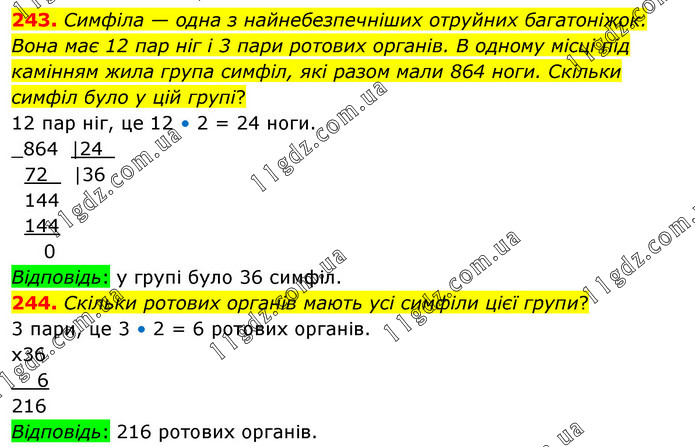 Симфіла — одна з найнебезпечніших отруйних багатоніжок. Вона має 12 пар ніг і 3 пари ротових органів. В одному місці під камінням жила група симфіл, які разом мали 864 ноги. Скільки симфіл було у цій групі? 12 пар ніг, це 12 • 2 = 24 ноги. Відповідь: у групі було 36 симфіл. 244. Скільки ротових органів мають усі симфіли цієї групи? 3 пари, це 3 • 2 = 6 ротових органів. Відповідь: 216 ротових органів.