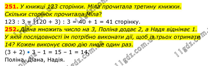 251. У книжці 123 сторінки. Міла прочитала третину книжки. Скільки сторінок прочитала Міла? 123 : 3 = (120 + 3) : 3 = 40 + 1 = 41 сторінку. 252. Діана множить число на 3, Поліна додає 2, а Надя віднімає 1. У якій послідовності їм потрібно виконати дії, щоб із трьох отримати 14? Кожен виконує свою дію лише один раз. (3 + 2) • 3 – 1 = 15 – 1 = 14. Поліна, Діана, Надія.