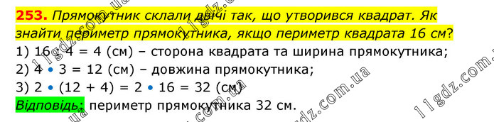 Прямокутник склали двічі так, що утворився квадрат. Як знайти периметр прямокутника, якщо периметр квадрата 16 см? 1) 16 : 4 = 4 (см) – сторона квадрата та ширина прямокутника; 2) 4 • 3 = 12 (см) – довжина прямокутника; 3) 2 • (12 + 4) = 2 • 16 = 32 (см) Відповідь: периметр прямокутника 32 см.