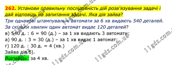 Установи правильну послідовність дій розв'язування задачі і дай відповідь на запитання задачі. Яка дія зайва? Три однакові штампувальні автомати за 6 хв видають 540 деталей. За скільки хвилин один автомат видає 120 деталей? в) 540 д. : 6 = 90 (д.) – за 1 хв видають 3 автомати; а) 90 д. : 3 = 30 (д.) – за 1 хв видає 1 автомат; г) 120 д. : 30 д. = 4 (хв.) Зайва дія б). Відповідь: за 4 хв.