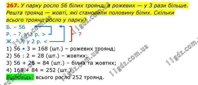 У парку росло 56 білих троянд, а рожевих — у 3 рази більше. Решта троянд — жовті, які становили половину білих. Скільки всього троянд росло у парку? Б. – 56 Р. – ?, у 3 р. > ? Ж. – ?, у 2 р. < 1) 56 • 3 = 168 (шт.) – рожевих троянд; 2) 56 : 2 = 28 (шт.) – жовтих; 3) 56 + 28 = 84 (шт.) – білих та жовтих; 4) 168 + 84 = 252 (шт.) Відповідь: всього росло 252 троянд.
